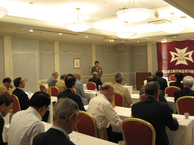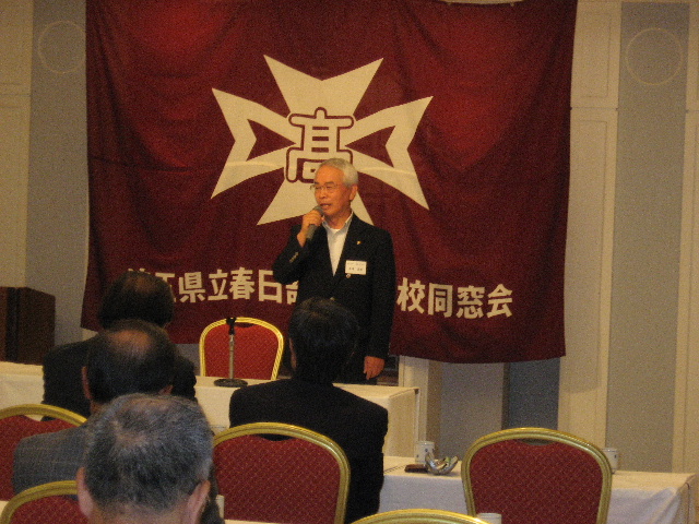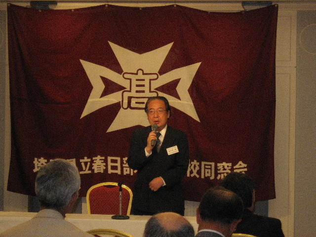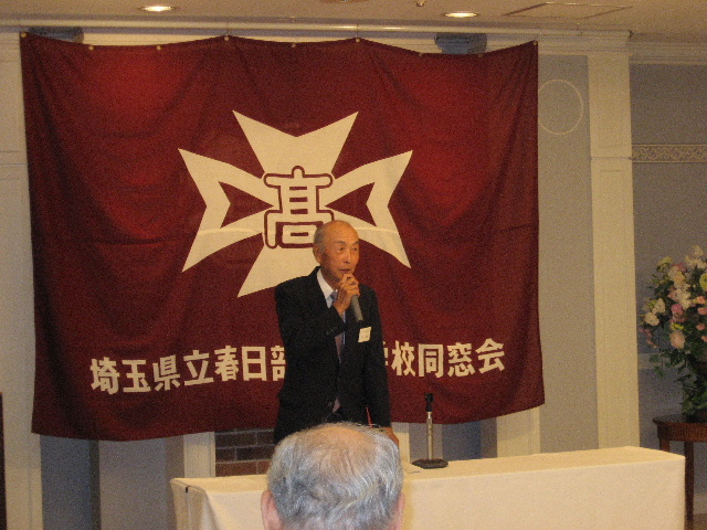 つづいて、新しく入会された会員の紹介があり、その後、来賓の佐久間健同窓会本部副会長からご祝辞をいただきました。佐久間副会長からは、「上尾伊奈地区からは、通学区の関係で長期に渡って春高を受験できず、春高に入学できない時期を経て今がある。その辛い間にも同窓会の活動を継続してきたことに感謝したい。」との温かい言葉をいただきました。