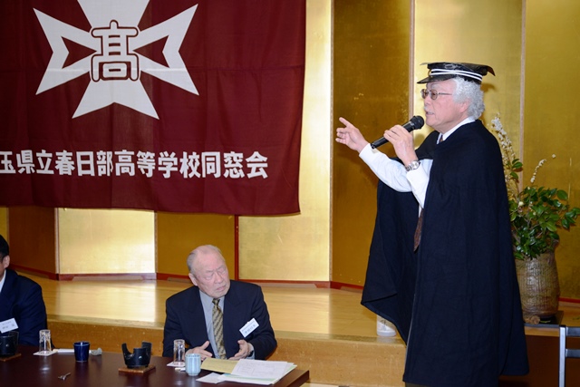 冒頭は、11月の総会において新たに副会長になられた、安孫子征さん(高13回卒)から、「鹿児島と私の青春時代」と題したご講演をいただきました。安孫子さんは、水原秋桜子や加藤楸邨ともゆかりのある、市内粕壁にある安孫子医院の現院長先生でいらっしゃいます。講演は、安孫子医院と水原病院とのご縁の中で、安孫子医院で診療をしていた水原秋桜子から、当時の春高の教員が俳句の薫陶を受けた話に始まり、安孫子先生が大学生時代を過ごされた鹿児島のお話となりました。中でも、桜島が1年に800回から900回も噴火するという話や、西郷隆盛像の話、また薩摩焼酎の「前割り」という飲み方の話など、ユーモアを交えて大変楽しく拝聴させていただきました。講演の最後には、七高(鹿児島大)の寮歌をご披露いただきました。寮歌の巻頭言で「北辰斜め」という台詞が繰り返されますが、これは北日本だと天頂にある北極星が、鹿児島では斜めに指すということをいうのだそうです。