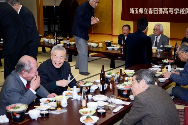 その後、ご出席いただいたご来賓の皆様から、これまたリレートークで俳句ゆかりの古利根散策の話や、あるいは古利根川の再生整備のお話などに因むご挨拶をいただいたき、懇親会に移りました。懇親会では、いつもどおり会場のあちこちで話が弾み、笑いが起こり、和やかな新年の集いとなりました。会の後半では、当日飛び入り参加の三遊亭楽生師匠による小話でさらに盛り上がりを見せ、最後は、池田暢夫さん(高7回卒)のリードにより全員で校歌を3番まで歌い、「フレーフレー春高!」とエールを切って、皆様の健康と健勝を祝い、お開きとなりました。やがて春を迎えますが、今年は春から笑いに包まれ、とても縁起がいい始まりとなりました。