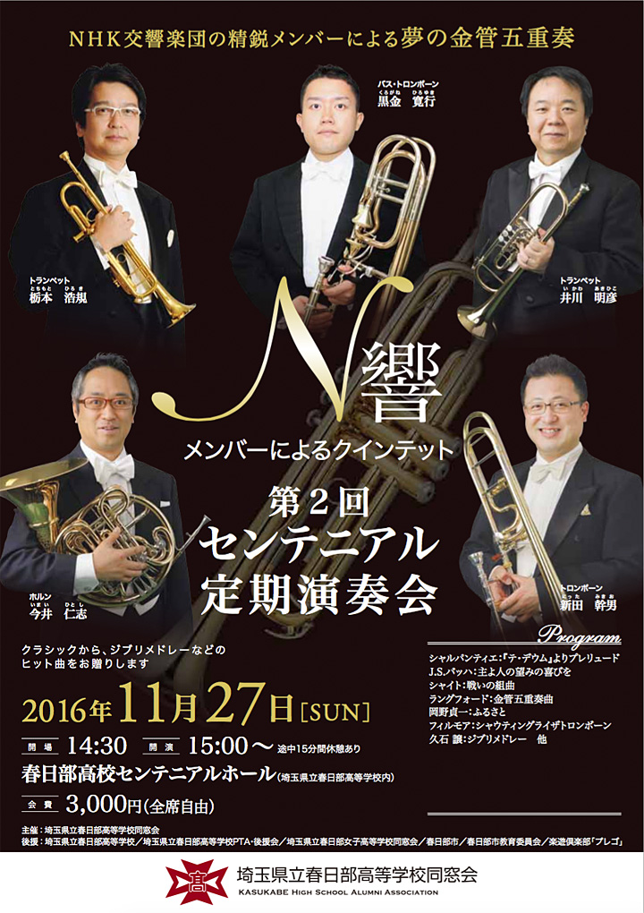 春日部高校同窓会では、音楽ホールを活用した「春高文化の森」事業を推進しておりますが、音楽ホールの完成を記念して開演した「センテニアルオペラ」は、今年4月の公演で既に19回目を迎えました。また、毎年1月に行われるPTA主催の「ニューイヤーコンサート」も重要な文化行事として定着しております。これらに加え、昨年から新たに、N響精鋭メンバーによるセンテニアル定期演奏会を行うことになりました。お誘い合わせの上、お申込みくださいますようご案内申し上げます。