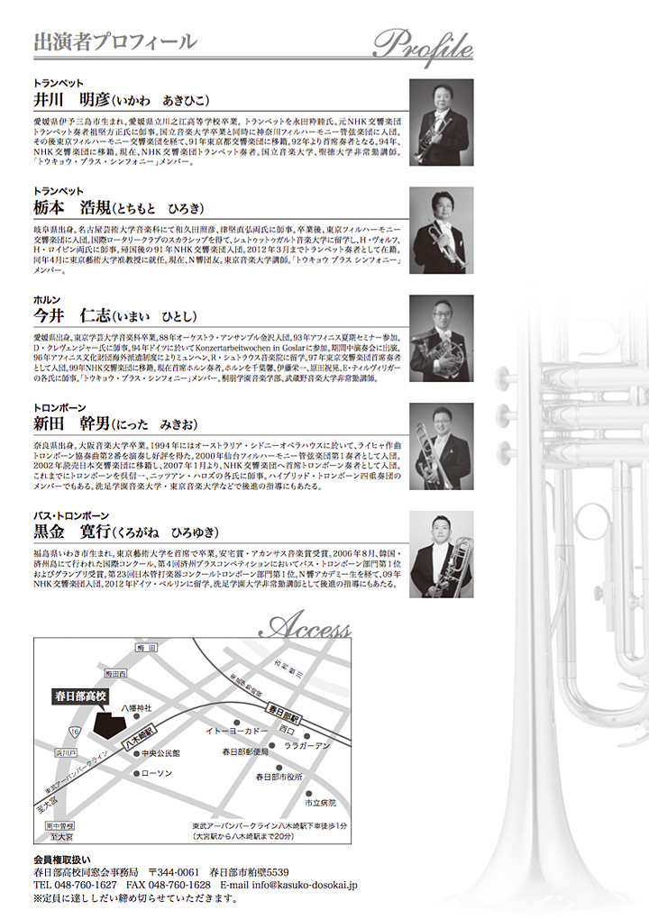下記の開催概要、およびチラシ画像をご覧ください。チケットのお申込みは、春日部高校同窓会事務局までお電話、ファックス、またはメールにお願いいたします。なお、完売になりました節はご容赦ください。