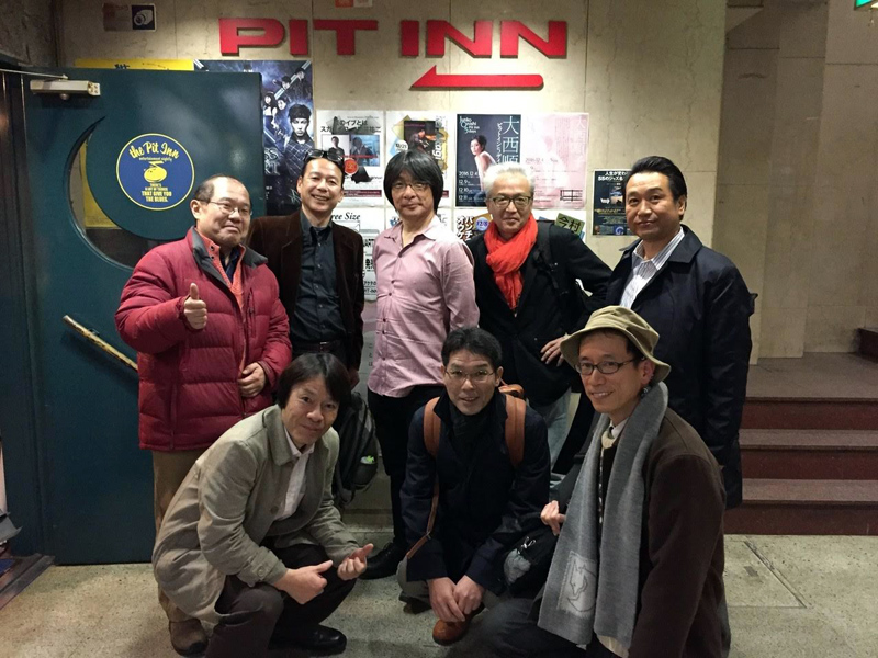 終演後、春燦々会のメンバーの要望で、熱演でふらふら状態の水谷君を無理矢理引っ張りだし、Pit inn入り口にて記念写真をとらせていただきました。