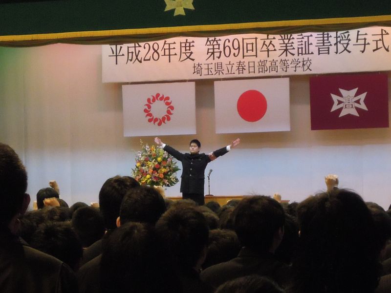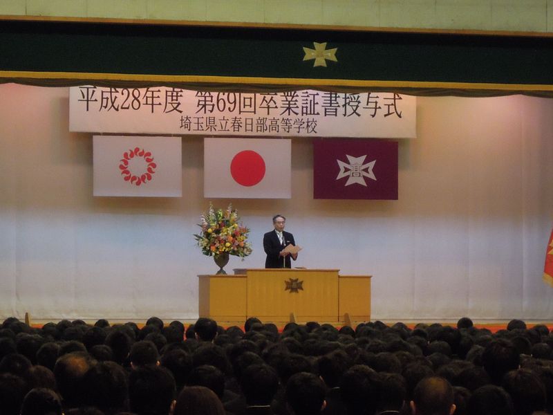 第69回卒業証書授与式が3月15日(水)、保護者・来賓・教職員・在校生約1500人に見守られる中、春日部高校体育館で盛大に挙行されました。益子篤行校長先生の式辞、布施川恵一PTA会長の祝辞に引き続き、日向英実同窓会長からも祝辞をいただきました。