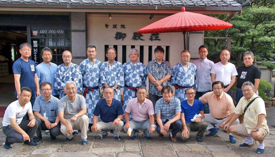春燦々会からの参加は12名(うち2名は京都合流)。引率の先生2名。 今回は29~32回卒の応援指導部OBの面々7名との合同旅行となった。 計21名の大所帯。