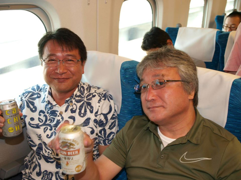 往路は東京駅8:30出発・のぞみ17号。東京が大雨の中、逃げるように新幹線に乗り込む。早速、おやつが配給された。適当にシャッフルされた座席でOBの方々とのコミュニケーションを楽しみつつ、徐々にヒートアップ。オトナのおやつはビールとお摘みセットで、全員に配布され、旅の興奮は早々に1回目のピークを迎える。