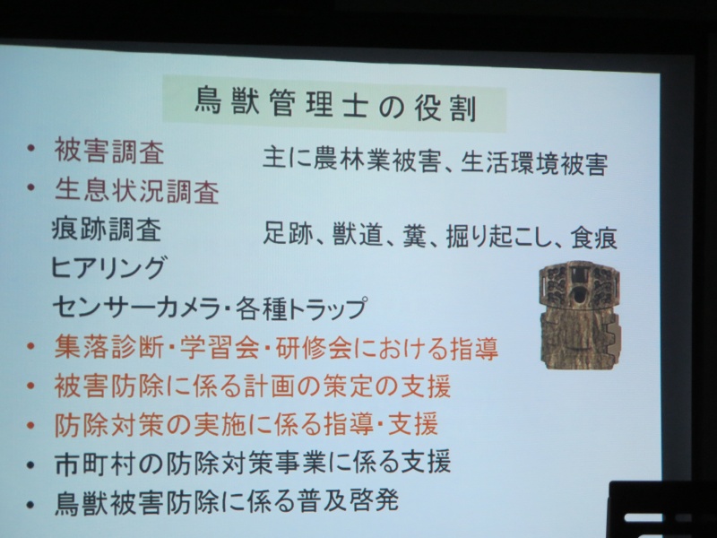 第一部の講演会は鳥獣管理士の資格を持っていらっしゃる斎藤悦夫さんにその鳥獣管理士の活動をテーマにお話しいただきました。農作物を荒らす害獣の被害を防ぐため地域の方と一緒になって対策を実施している様子を事細かく教えていただきました。我々が普段決して目にすることの出来ない貴重な活動を知る機会となり、会員の皆さんそれぞれに様々な興味を抱くことのできる講演となりました。