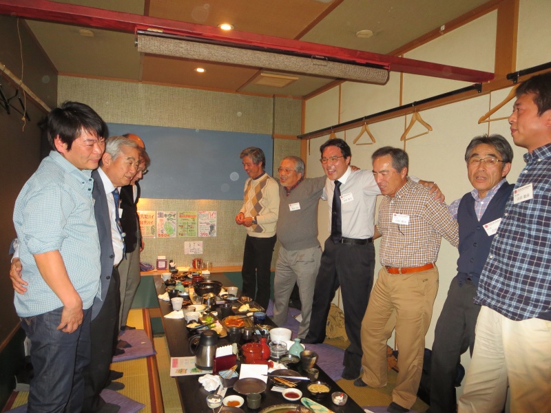 最後は例年どおり皆さんで肩を組んでの校歌斉唱でお開きとなりました。終わったところで早速次回の講師をこの場でお願いしたところ宇都宮大学の准教授でいらっしゃる岩永将司さんに快くお引き受けいただきました。岩永先生の日頃の研究成果を伺えるということで今から楽しみです。