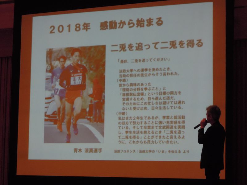 今年は、猪熊敏博さん(高35回卒・ワコール執行役員 広報・宣伝部部長)に講演をお願いしました。春高時代の同級生で2年生の担任をしている黒野先生から、講師の猪熊さんの略歴等について紹介があった後、講演に入りました。