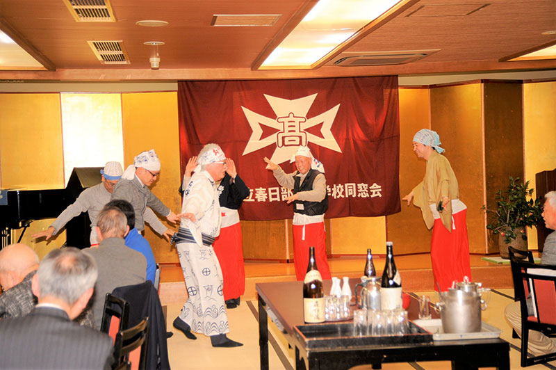懇親会の途中では、春日部春高会ではもはや恒例となりつつありますが、自称鹿児島親善大使の安孫子会長のご指導により、有志が輪になり即興で「鹿児島おはら節」の踊りが披露されました。楽生師匠も踊りの輪に加わり、会場の全員も拍子を合わせ、大いに盛り上がりました。