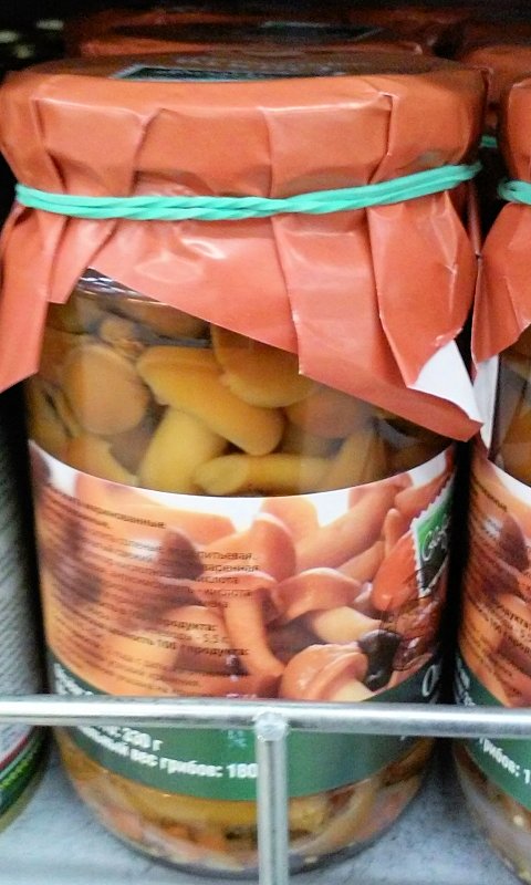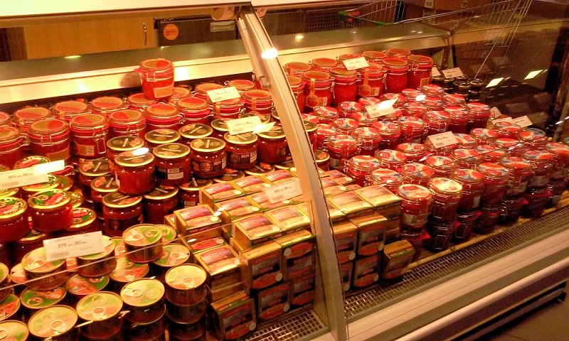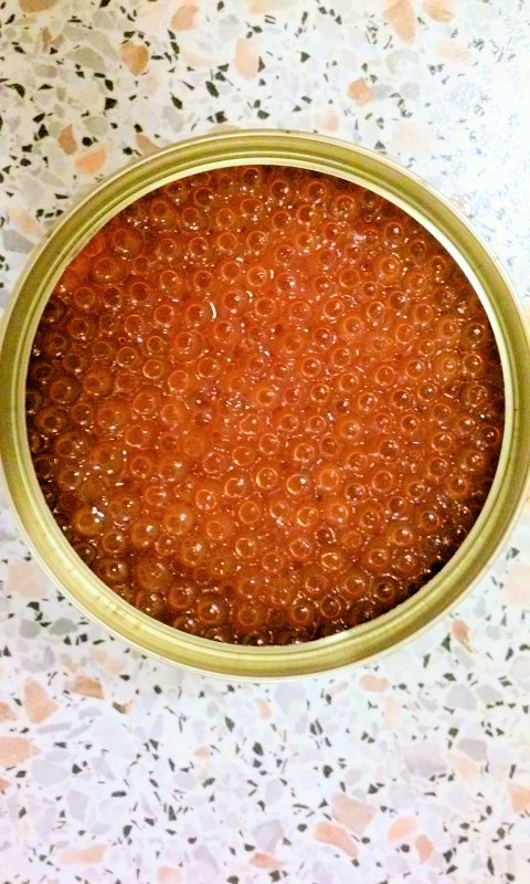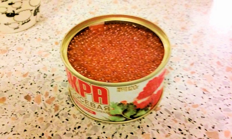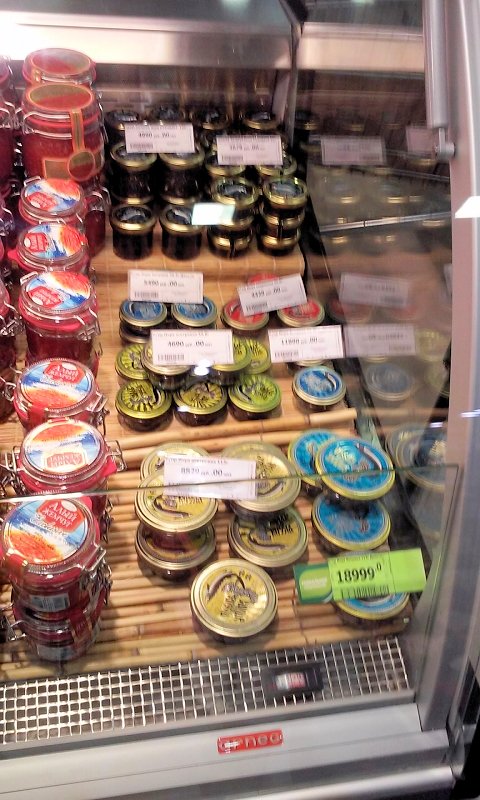 高級スーパーに行くと、イクラ(ロシア語で魚卵の意味)がズラリならんでます。いわゆる日本人がイクラと聞いて思い浮かべるのは鮭の卵ですが、これはクラスナヤ・イクラ=赤い魚卵、チエルナヤ・イクラ=黒い魚卵(キャビア)と言うそうです。赤い魚卵の右隣にちんまりと黒い魚卵コーナーあり。見づらいですが、右下の緑の値札には「18,999ルーブル」と書いてあります。今のざっくりレートで、1ルーブル=2円なので、4万円弱になります。お土産希望の方、いらっしゃいましたら前払いでお願いいたします。一般庶民が使うスーパーのイクラは120gで180円ほどで買えますが、かなり塩辛いので塩抜きして醤油と料理酒で味を調えて食べています。結構いけます。