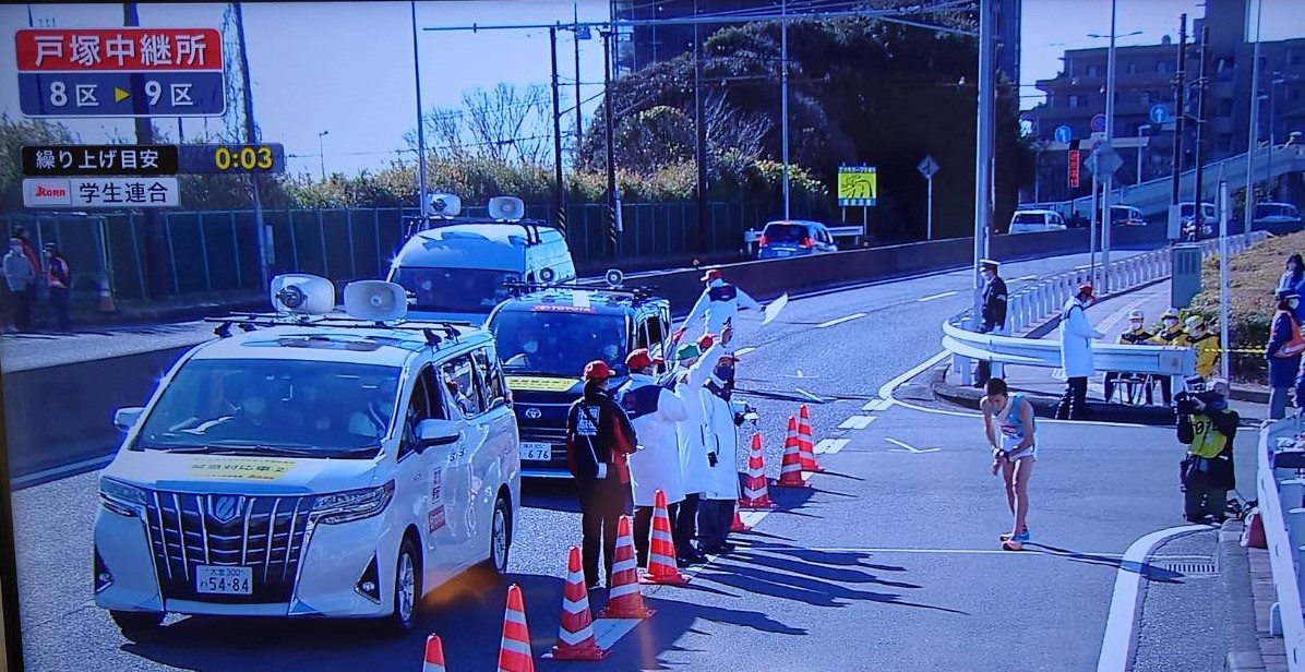 写真は9区スタート(残念ながら繰り上げスタート)と9区を現地で撮影したものと、映像からのものを掲載しました。なお、当日の審判車には、同窓会事務局長竹村さんが関東学連審判員として同乗されており、偶然にも写真映像の審判車内におり、皆川君の勇姿を見ていたとのことです。
