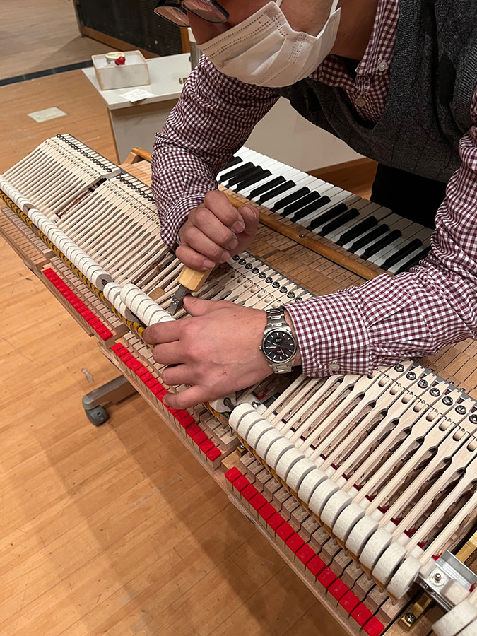 本校のピアノは国産ですが、鍵盤のタッチや音色など国産ピアノにはない軽やかで華やかな音色になるように調整しているとのこと。具体的には、中低音の弦は重厚な音が出るドイツ製、高音部の弦は音色が明るいフランス製に。また、鍵盤のタッチの重さや反発力を高音部はより軽やかに調整し、スタンウェイ(レベル)に再生させたいということでした。