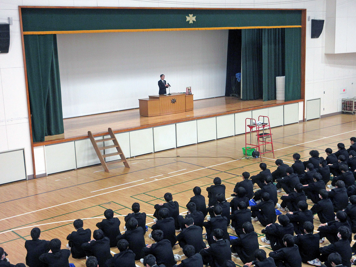 落ち着いた口調で淡々と話をされましたが、生徒達は真剣に耳を傾け、インパクトのあるものであったように感じました。話を終え降段するときは、生徒から拍手が湧いていました。