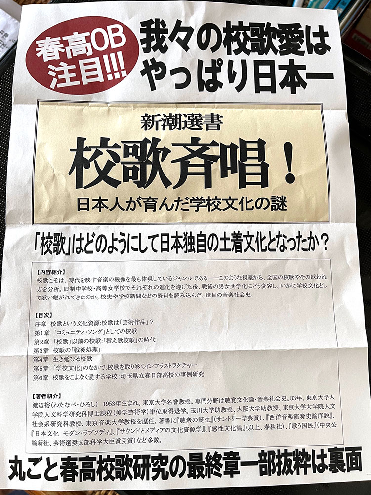 新潮選書「校歌斉唱!」~日本人が育んだ学校文化の謎~(著者 渡辺裕氏 東大名誉教授)全6章のうち、最後の第6章全編が春高校歌について記されています。目次には、「校歌をこよなく愛する学校:埼玉県立春日部高校の事例研究」とあり、目次に校名が特出しされているのは春高だけ。発売予定は7月25日。読むしかないでしょ?(写真はいただいたチラシ。見にくくて失礼しました)