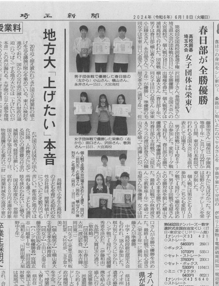 囲碁部県大会 団体・個人優勝、全国高校囲碁選手権へ出場 投稿日:2024/06/29 作成者: 事務局 ツイート 令和6年度全国高校囲碁選手権埼玉県大会において(6/15 16開催)、団体戦、個人戦とも優勝し、全国大会に出場することとなった。団体戦のメンバーは、永井晶君(2年) 小山稜太君(2年) 横山蒼大君(1年) である。個人戦では、横山蒼大君が優勝した。 全国大会は、7月22日から東京の日本棋院で行われる。 写真(埼玉新聞より) ツイート
