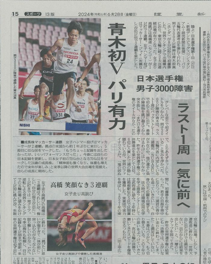 青木涼真選手(高68回)、陸上日本選手権男子3000障害優勝 パリ五輪ほぼ確実 投稿日:2024/06/29 作成者: 事務局 ツイート 2024年6月28日、新潟デンカビッグスワンスタジアムで開催された陸上日本選手権男子3000障害で初優勝を遂げた。パリ五輪に向けては、すでに世界ランキングで出場圏内におり、この優勝で東京五輪に続く2大会連続の出場が、ほぼ確実となった。パリ五輪の陸上競技は8月1日から始まり、男子3000障害予選は8月5日の日程である。 (写真、6/28読売新聞より) ツイート