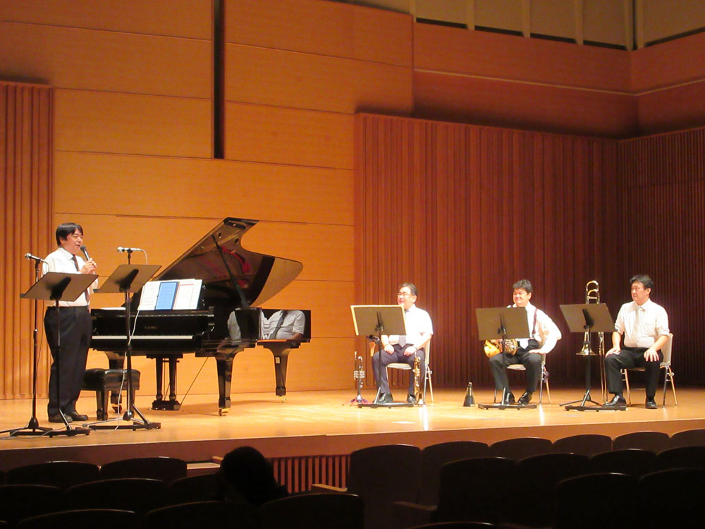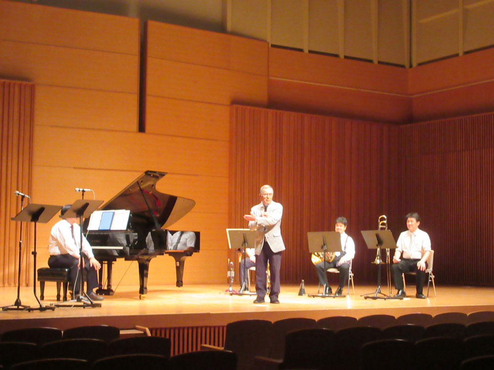 演奏は、高33回卒の立原勇氏によるメランジェ合奏団選抜メンバーで演奏されました。メランジェ合奏団は、東京藝術大学で学んだ世代の違う気心の知れた仲間が集い、2014年に結成され、声楽(ソプラノ・テノール)・金管五重奏・ピアノ等による新しい形態のアンサンブルとのことです。