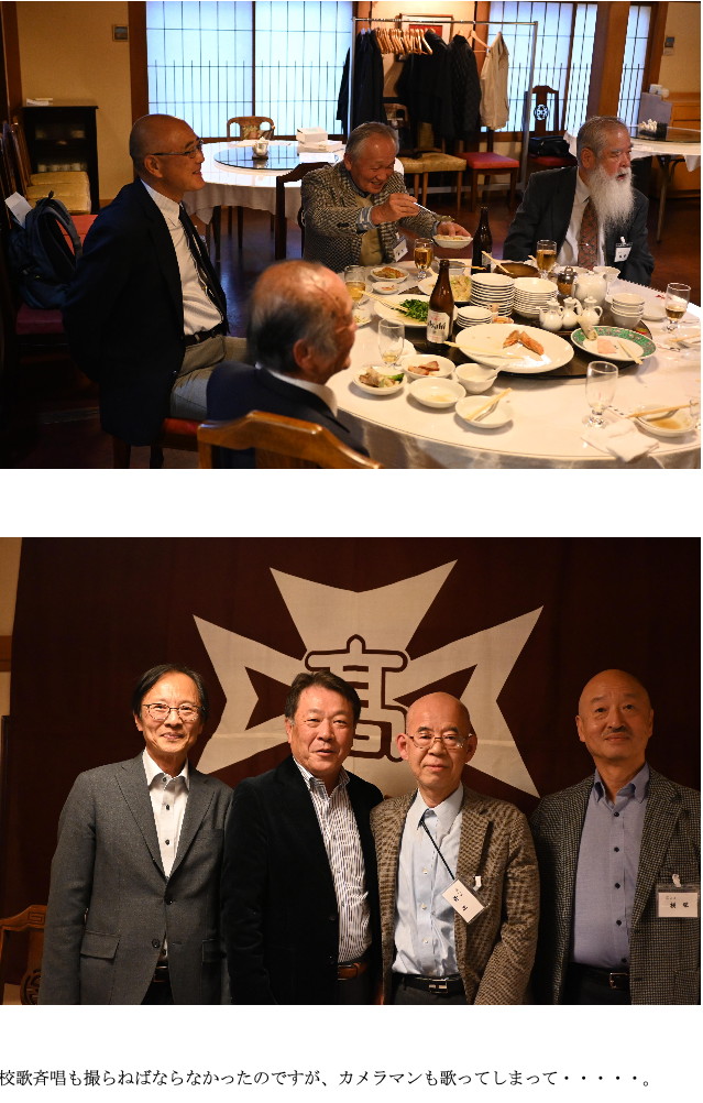 懇親会は、総会参加者の記念撮影を行った後、なかなかビールが出てこなかったのですが、初代会長 野口会員(4回)からのご挨拶をいただいていたところ、丁度スピーチが終わる時点でビールが回り、すぐさま野口会員の高らかな発声で乾杯が行われました。少しだけグレードを上げた中華料理を食べつつお酒を酌み交わし、各テーブルにおいて和やかな雰囲気のなかでそれぞれの話題に興じた後、参加された全会員から、親睦を深める思い思いのスピーチをいただきました。宴の締めは、大塚聡幹事のリードで恒例の校歌斉唱及び横浜春高会へのエールが元気よく響き、来年の再会を誓ってお開きとなりまし た。