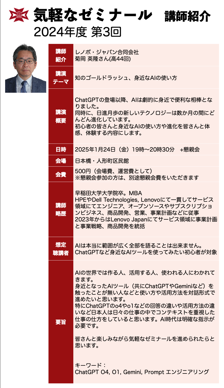 今回の気軽なゼミナールは、レノボ・ジャパン合同会社 菊岡 英隆さん(高44回)に