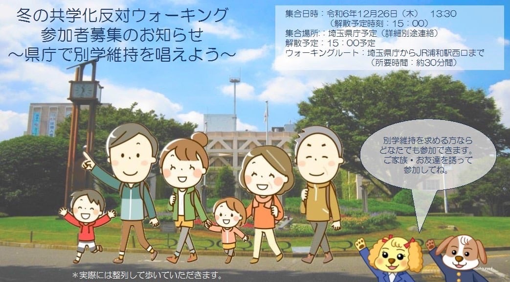また、12月26日(木)午後2時頃から別学校卒業生有志を中心に、在校生も含めて約200人(予定)が県庁から浦和駅まで「共学化反対ウォーク」をするということです(添付チラシをご覧ください)。希望者は誰でも参加できるようです。