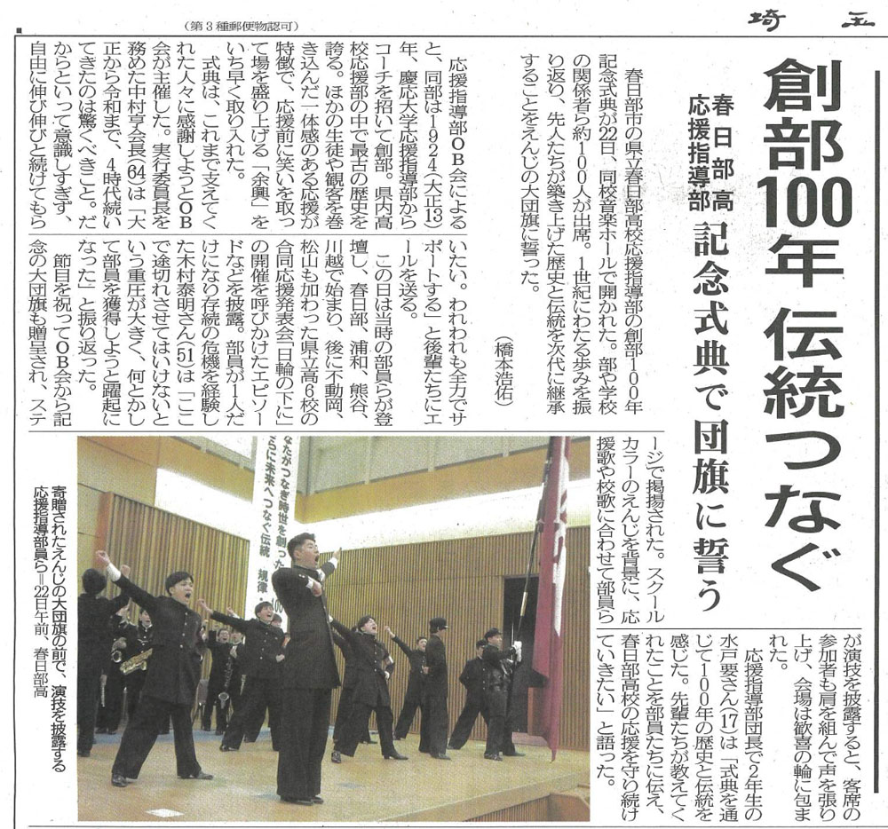 応援指導部100周年式典開催、新聞掲載紹介 投稿日:2025/03/24 作成者: 事務局 ツイート [ 寄稿者:春日部高校同窓会事務局 ] 2025年3月22日(土)に応援指導部100周年式典が春日部高校内音楽ホールにて開催されました。 その新聞記事が数社の新聞社から掲載されています。 ここでは埼玉新聞に3月24日(月)掲載の記事をご紹介します。 ツイート