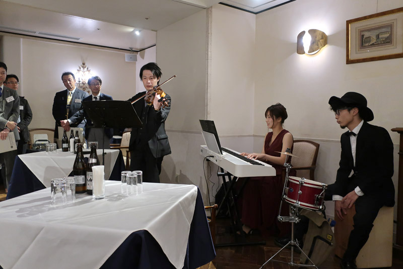 須藤晋良氏(高49回)が企画した歓迎の音楽で開会した東京春高会、同窓生によるビジネス交流を主眼としている会らしく、乾杯の後は会場のあちこちで名刺交換と歓談の輪ができました。今回は8名の方が初めて参加してくださり、お一人おひとりにじっくりと自己紹介をしていただきました。